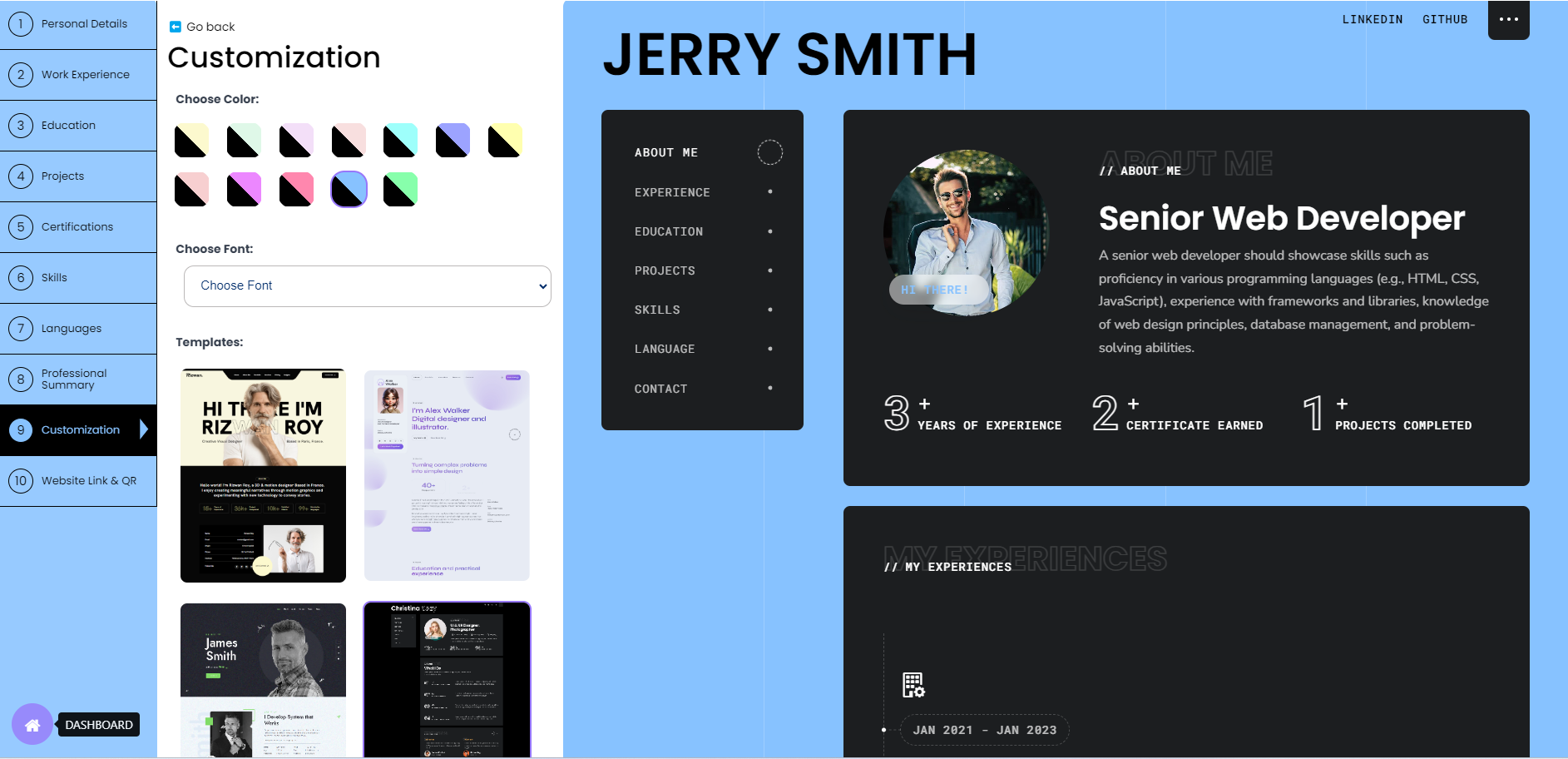 Ready to See Your Profile at the Top? Craft your unique professional website in just minutes. Our user-friendly platform allows you to customize every aspect of your site, ensuring you highlight your achievements in the best light. Users leveraging our customization features enjoy a 70% higher chance of appearing at the top in job searches.